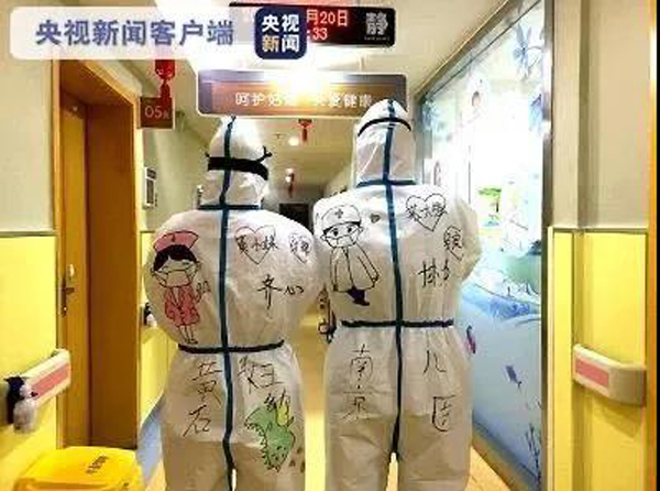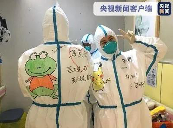 一幅幅充滿童趣的圖案,承載著醫護人員的愛心,沖淡了疫情給帶給孩子們的心理壓力,防護服隔離了病毒,卻沒有隔離愛。
