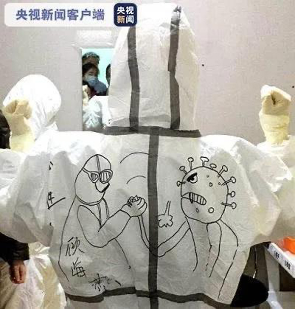 為消除孩子們的恐懼,護士在防護服上畫畫,這是江蘇支援黃石醫療隊隊員,南京市兒童醫院護士馬良超,進入隔離區前拍攝的照片。
